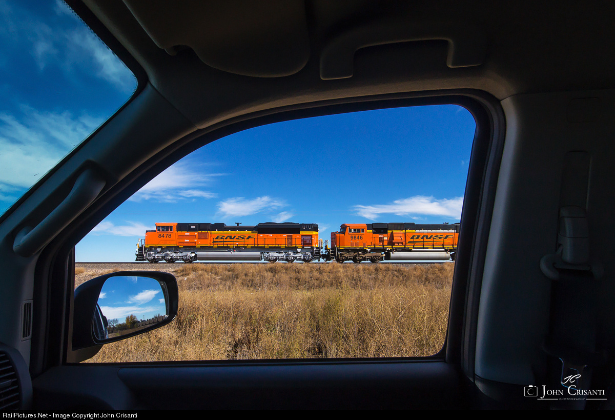 | Looking from inside my Nissan Xterra, a brand new BNSF SD70ACe no. 8478 leads a "Swoosh" painted SD70MAC and CitiRail ES44AC on this coal empty just south of Berthoud, CO. |