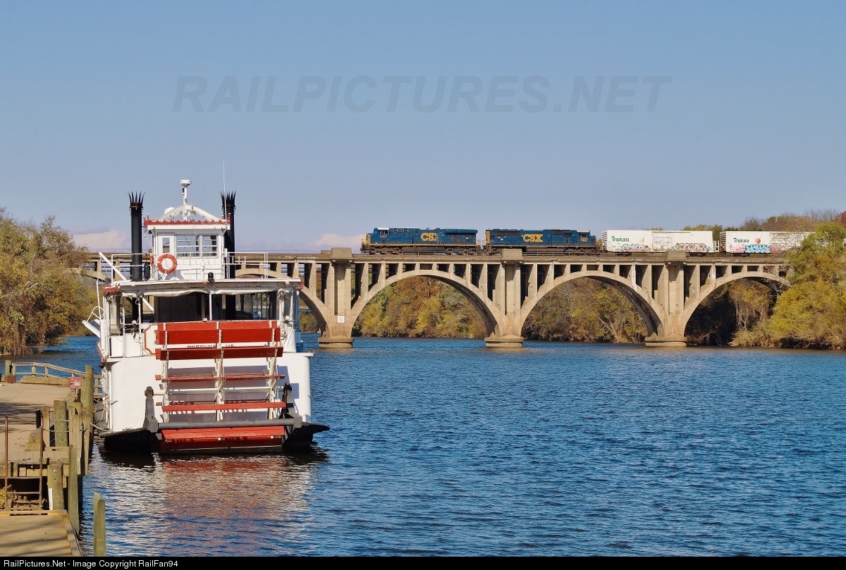 With the sun shining on a gorgeous fall morning, the southbound juice train is seen crossing the Rappahannock River, with the Fredericksburg Paddle-wheel boat sitting at the dock, soon to be gone for the winter.