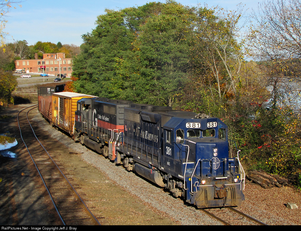 In a somewhat rare case of good timing with sun and trains, Pan Am's MABA had waited nearly two hours at Waterworks for NMBK to clear Calais Junction on October 25, 2014. Due to both trains having "high" cars, the siding through town could not be utilized. Finally 381 led the westbound along the Penobscot River toward Northern Maine Junction.