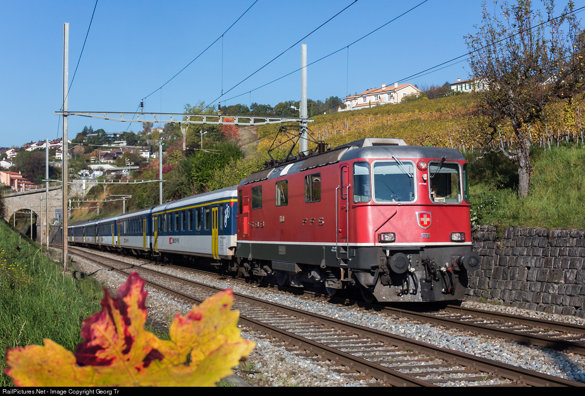 | Re 4/4 II # 11131 with a push pull train of standard cars type I/II as relief train 82427 from Lausanne to Palezieux, near Bossière. |