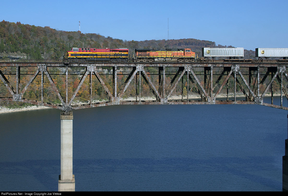 KCS and BNSF power leads a northbound NS train over the Cumberland River at Burnside.