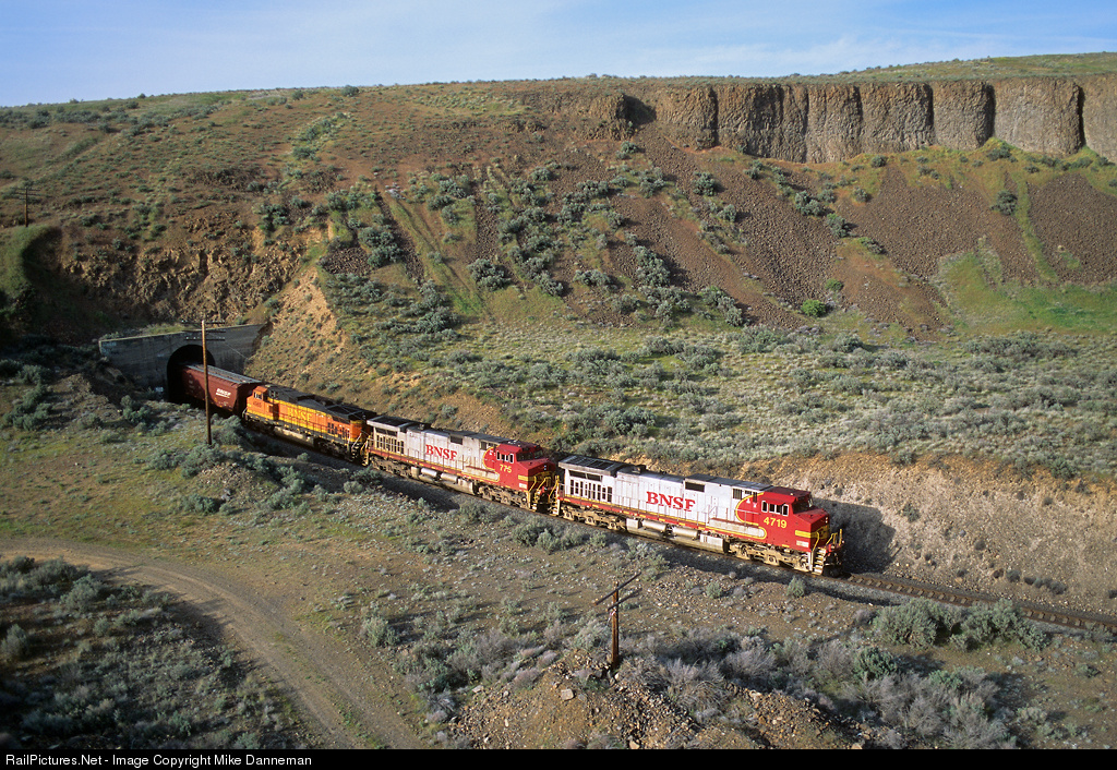 Led by warbonnet C44-9W No. 4719, an eastbound BNSF grain train exits Tunnel 11.1 at Crater between Trinidad and Quincy, Washington, on April 18, 2010.