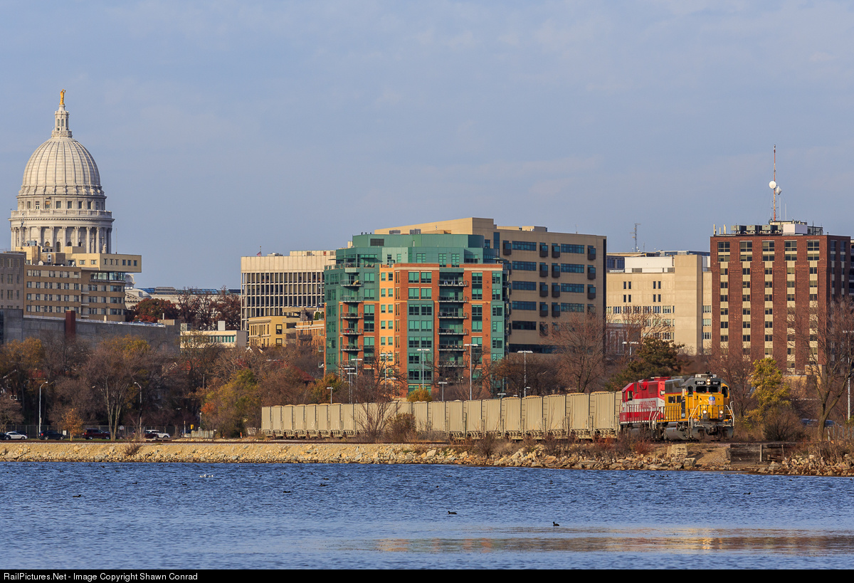 | With the Wisconsin Capitol building looming, another load of aggregate for the brand new Lycon ready-mix plant in Oregon, WI crosses the causeway over Monona Bay. Seeing as the ex-C&NW line from Madison to Oregon has only been reopened for just over a month this is still quite the fresh scene to see. |