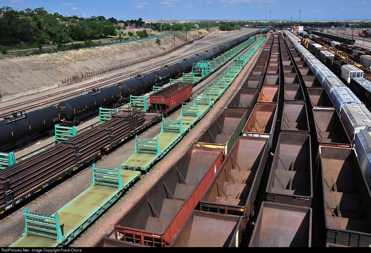 | Unit trains are the name of the game in Pueblo these days as many types are seen at the former Rio Grande yard. From left to right we have a unit crude oil train, unit empty and loaded rail trains, four tracks of empty coal hoppers and finally a unit train of covered hoppers full of cement rounding out the various types of units trains seen here these days. |