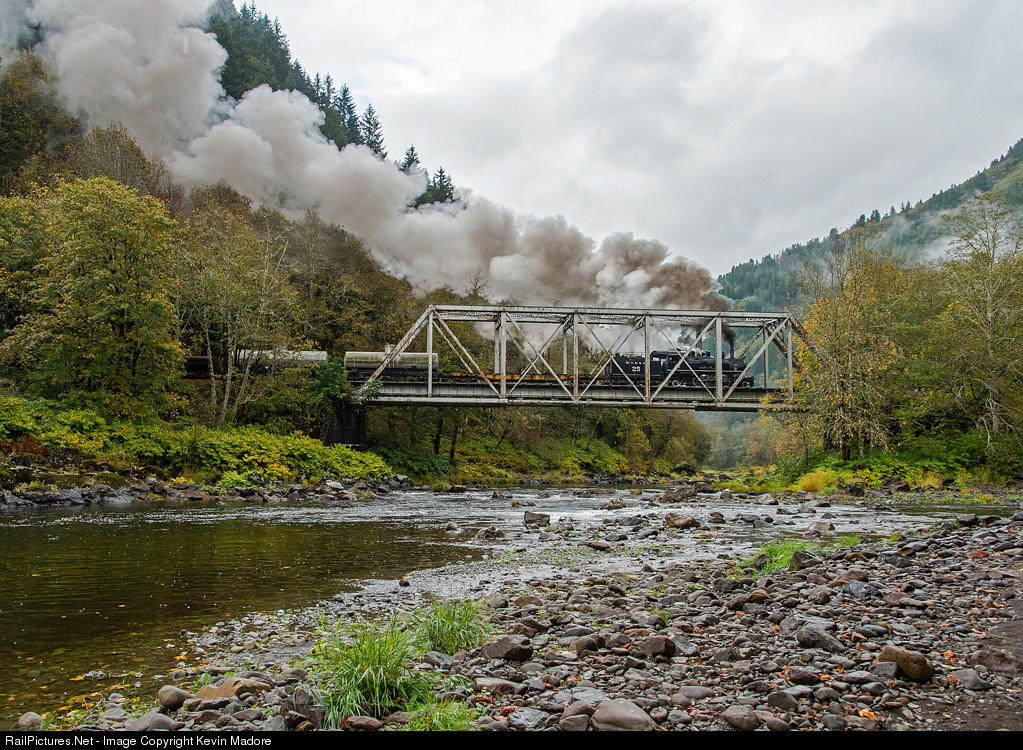 Over the river and through the woods. With a gentle rain falling, the former McCloud River Railroad #25 hauls a mixed freight across the confluence of the Nehalem and Salmonberry Rivers, in the remote hamlet of Salmonberry, Oregon. This trackage is the former Southern Pacific Tillamook Branch, which was abandoned by the railroad in 1989. Since then, the line has been operated by short-line railroads such as the Port of Tillamook and now, the Oregon Coast Scenic Railroad (OCSR). Since abandonment by the SP, maintenance of this remote line has been a struggle. In the late 1990s, and 2000s floods and winter storms caused millions of dollars in damage to the infrastructure, taking the line out of service on numerous occasions. Fortunately, the current operators have persevered, and today, the OCSR operates a total of 46 miles of trackage, running all the way from old Tillamook Naval Air Station to a point just east of of the location seen here.