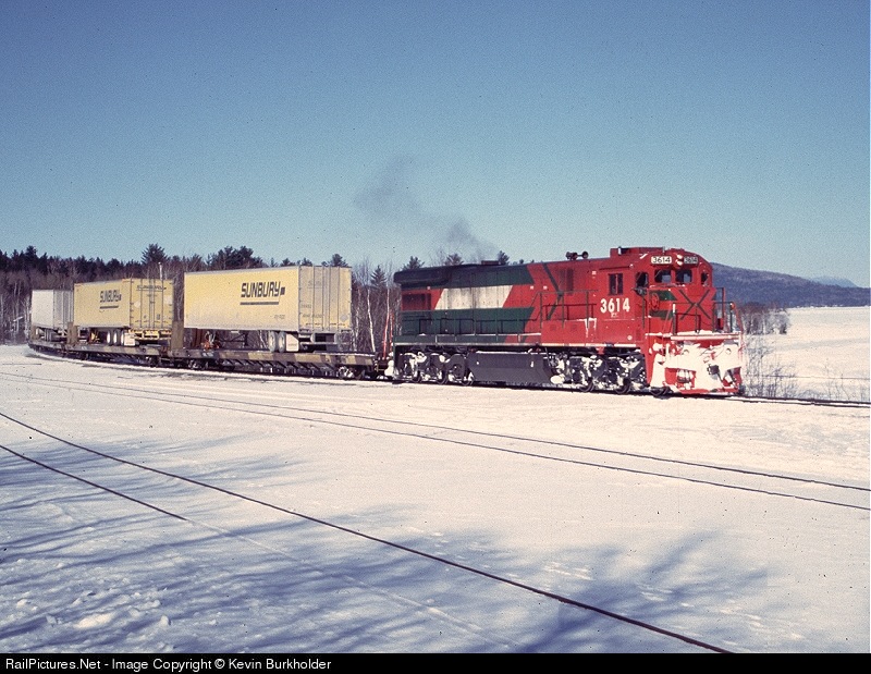 MMA's eastbound intermodal rounds the curve at Greenville Jct., ME along Moosehead Lake on Sunday, February 15, 2004. The train is under control of single C30-7 3614, painted for a stint it was supposed to work in Mexico.