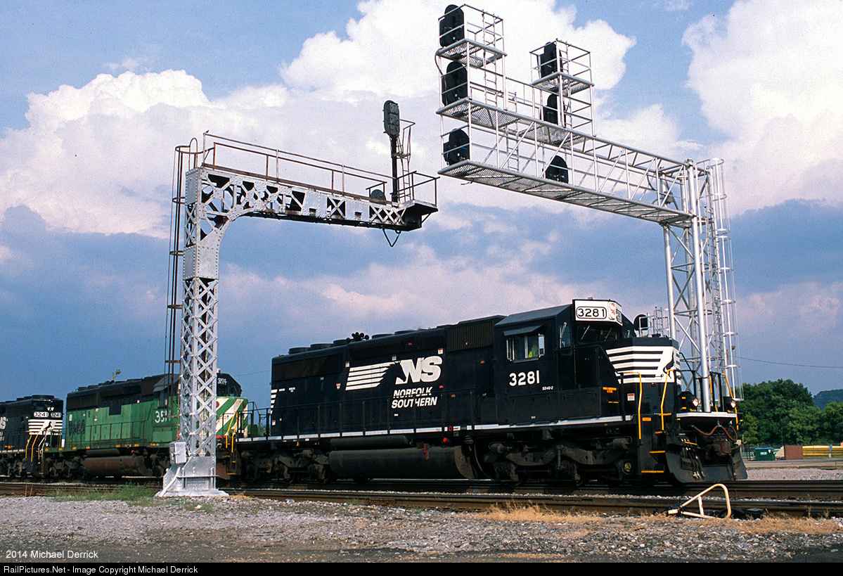 | A scene which has played out in so many locations in 2014 is well demonstrated on this August day in Birmingham. While the venerable cantilever is still in place and governing movements, its PTC-compatible replacement stands at the ready. And there is no doubt NS 3281 passed under this signal many times, albeit with a proper Southern Railway high nose, rather than the current "Admiral Cab." |