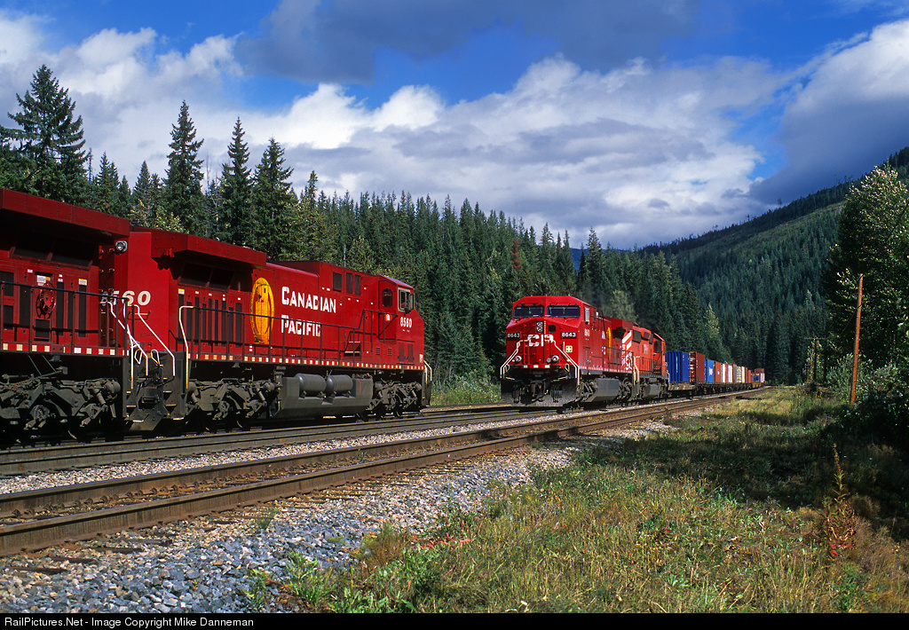 A westbound Canadian Pacific intermodal train passes a set of helpers at Rogers, British Columbia, on September 16, 2002. Some tunnel work was being done on the Mount Macdonald Tunnel, requiring some westbound trains to use the older, steeper main line through the Connaught Tunnel, briefly requiring the use of helpers out of Rogers once again.