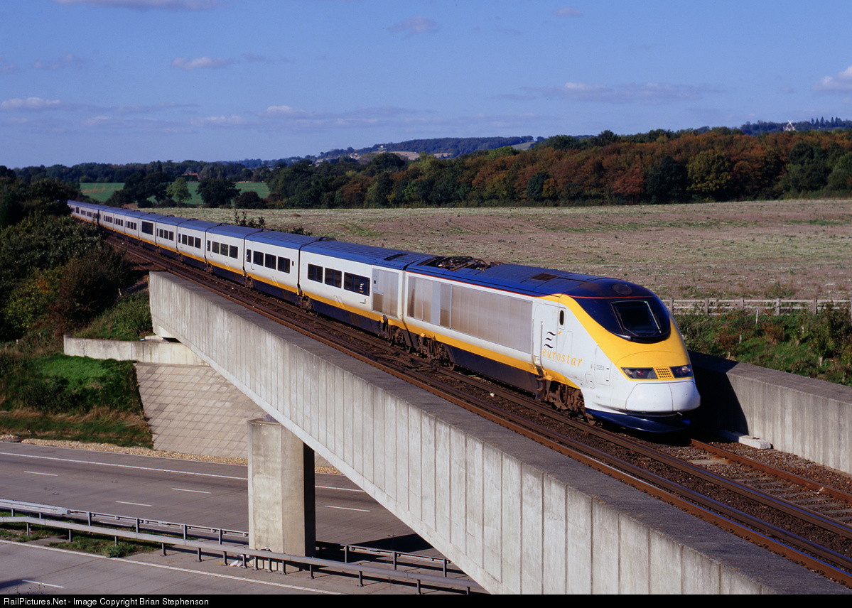 | One of the Eurostar sets that has only been used in France for the past decade is seen forming a London Waterloo to Paris service crossing the M20 bridge at Tutt Hill running on the third rail classic line to the Channel Tunnel diverted via Maidstone East before the high speed line was built. This is the set that Jean-Marc Frybourg recently posted being towed by a diesel having been withdrawn from service and probably going for scrap. |