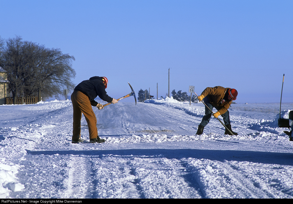 Tough winter day on the Kyle—2 During plowing operations after a large snowstorm, one of the points to be very watchful of is ice and snow buildup at grade crossings. Even though trains are incredibly heavy, flanges can still be lifted by ice in the flangeways, with dire consequences. After a late December storm buried parts of western Kansas in over 30 inches of snow, Kyle Railroad operated a plow extra west of Colby on January 2, 2007. Here, a Kyle MofW crew carefully cleans the flangeways of County Road 11 grade crossing at Levant, Kansas, before the arrival of the plow extra. With winter approaching, I thought it might be fun to look a series of images of Kyle battling the elements on a tough winter day in western Kansas…