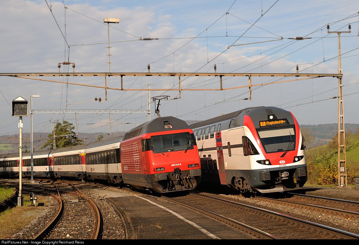 | IR 2073 Basel - Zurich Airport with RABe 511 030 meets IR 1970 Zurich - Basel with 460 012 in the former station Effingen, nowadays no train stops here. |