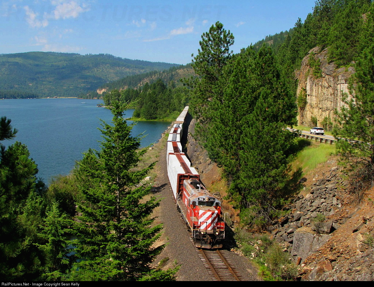 A beautiful summer morning in Idaho is made even better by the appearance of the Pend Oreille Valley Railroad's local on its eastward trip to Sandpoint, Idaho to transfer with BNSF. It is seen here along the north bank of the Pend Oreille River between the towns of Priest River and Laclede, about to pass through a rock cut.