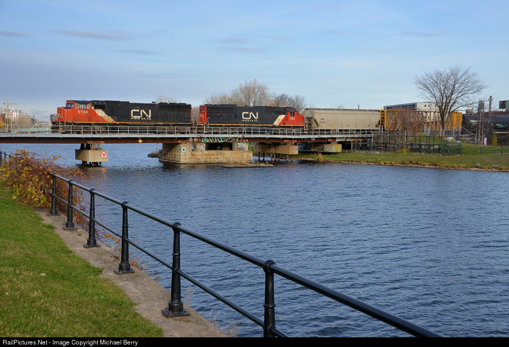 Back to running in daylight. CN 323 (St. Albans, VT - Montreal, Qc) and its counterpart CN 324 had been running exclusively at night for a number of months due to trackwork on the New England Central. However since a week or two ago it runs principally during the day, as here, where CN 323 is crossing the Lachine Canal in Montreal, its run from St. Albans nearly over. Power is two SD units, CN 5740 (SD75I) and CN 5453 (SD60).