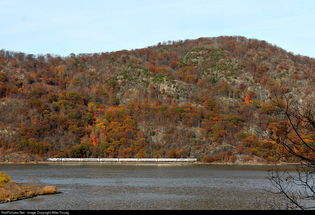 From across the Hudson river a northbound Metro north commuter train heads north along the river.