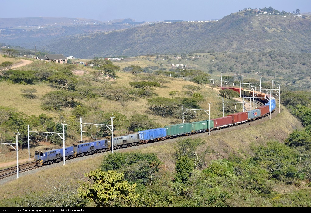 | 18-177 / 18-153 / 18-052 are outward bound from Durban with a load of containers. The train is seen here busy winding its way through the rural hills of the Shongweni / Cliffdale area, having departed Durban about 1½ hours earlier, bound for Kaserne in Johannesburg. |