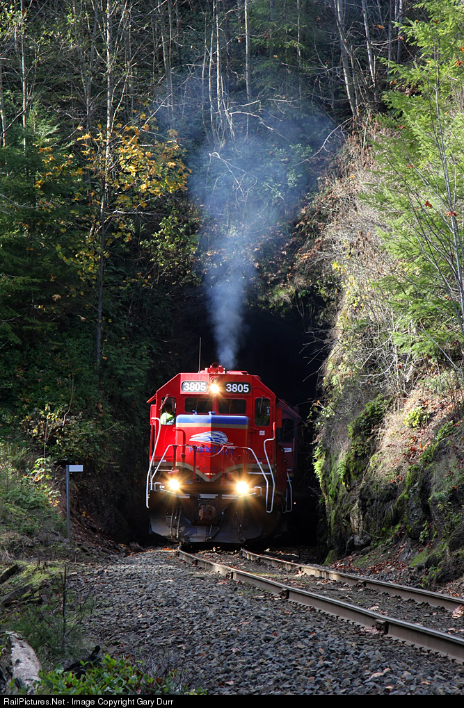 Patriot Railroad's Columbia & Cowlitz Railway Woods line, runs from Longview, Washington to Headquarters, Washington, where there is a county owned land fill that the railroad services. Here we see an up hill extra led by GP-38 #3805 plus three other units Exiting the secluded and rarely photographed Ostrander Tunnel. this train is hauling Tank cars up to the landfill. These empty tank cars are to be loaded with waste water to be brought down to a water treatment facility in Kelso