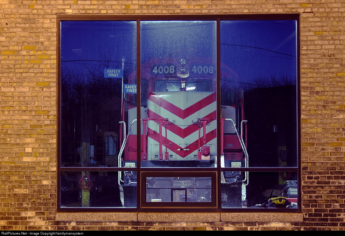 | Warm Slumber- WSOR 4008 looks out to a cold blue hour, from the warm comforts of WSOR's Janesville Shops. Work quick here, the relative temperature outside is a balmy -10 at the moment! |