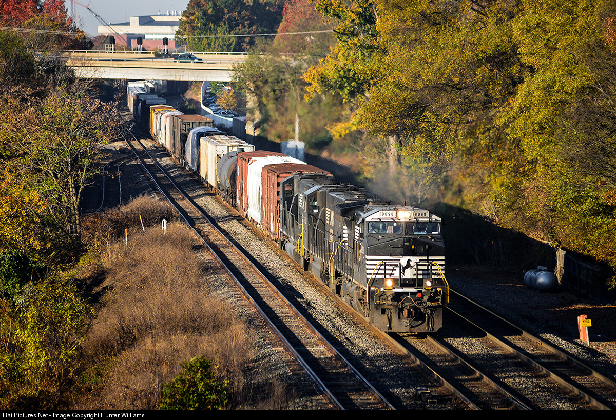 | One of Norfolk Southern's workhorse dash 9 locomotives leads northbound manifest freight train 36Q through Greensboro, NC on November 10, 2014. |