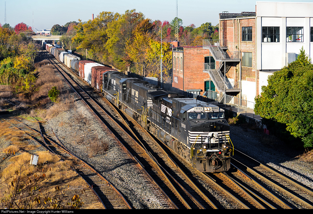 | One of Norfolk Southern's workhorse dash 9 locomotives leads northbound manifest freight train 36Q through Greensboro, NC on November 10, 2014. |