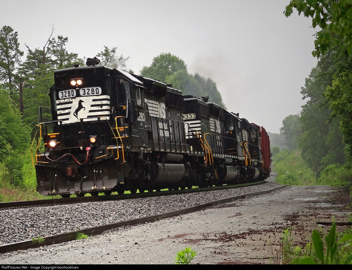 | NS P90 led by Ex-Southern Railway high hood SD40-2 #3280 see here by Traber between Liberty and Central, SC during a downpour on a rainy weekday morning Gainsville - Greenville turn. |