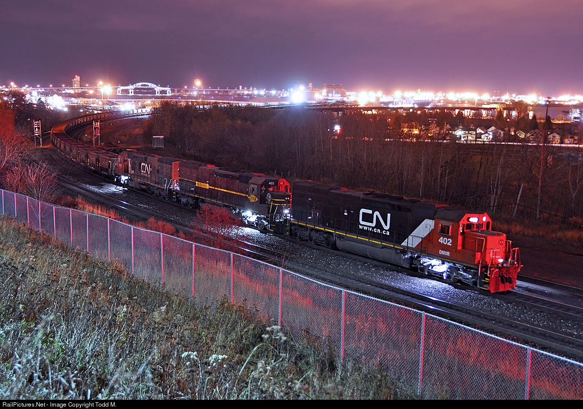 | DMIR 402, DMIR 403 and DMIR 408 sit on the curve for the approach to the CN dock 6 and stare at a red signal, waiting to return to Proctor yard with the empties. |