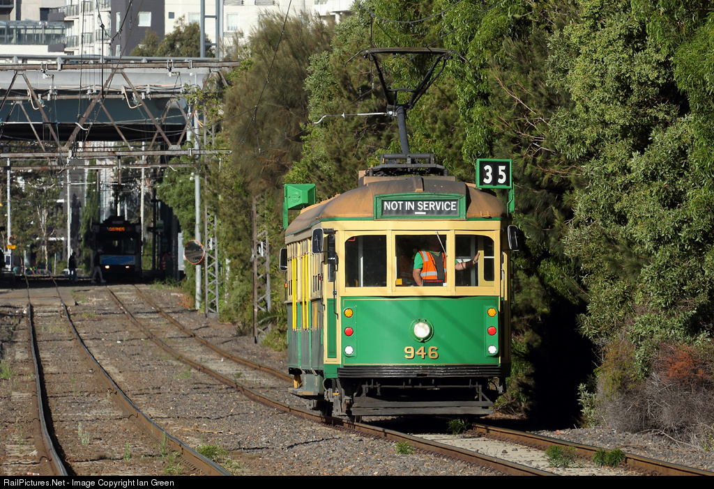 | After completing 8 hours of City Circle running, W8 class tram 946 runs in to Southbank depot via Montague. |