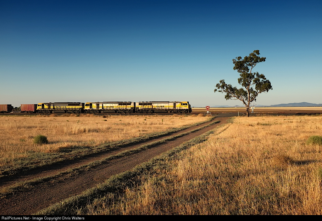 | 1105, 1102 and 1107 race No.5112 cotton train from Narrabri to Port Botany south near Nea, between Gunnedah and Werris Creek, at sunset. |