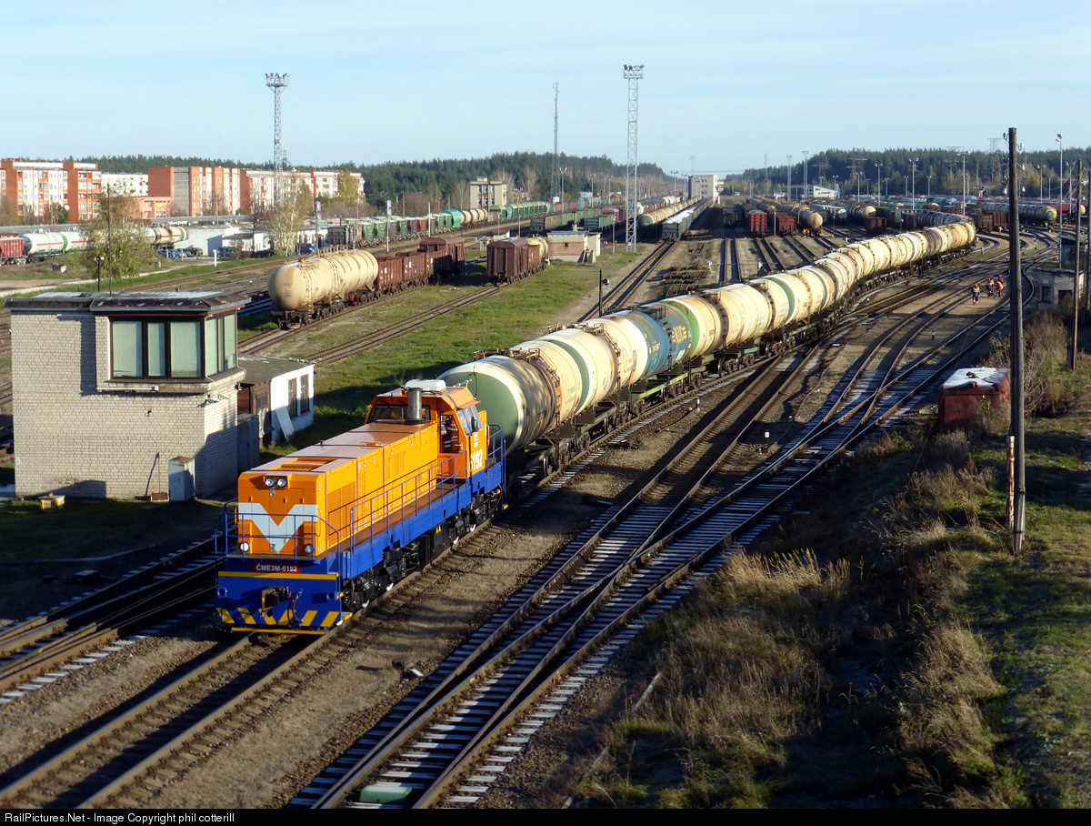 | ChME3M-6192 hauls a long rake of oil tanks out of the yard at the north end of Daugavpils. These locos are heavily rebuilt from ChME3 locos. |