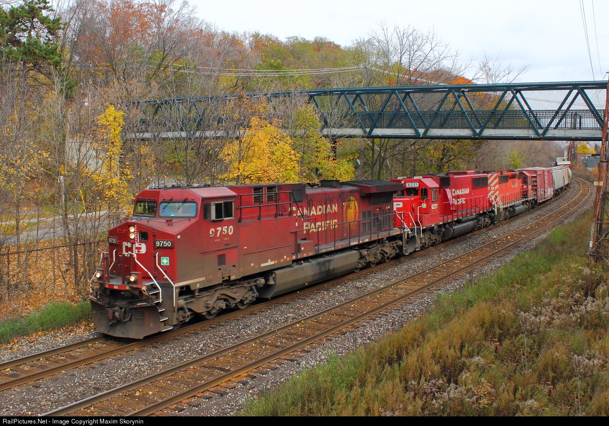 A CP WB headed for the MacTier Subdivision (Likely CP 421 or CP 301) is wasting no time getting by, and is seen unexpectedly passing Rosedale in this photograph. The consist was CP 9750, CP 6221 and CP 5919, adding some taste to the usual boring GE's. However, I'd like that leader swapped outa' there!