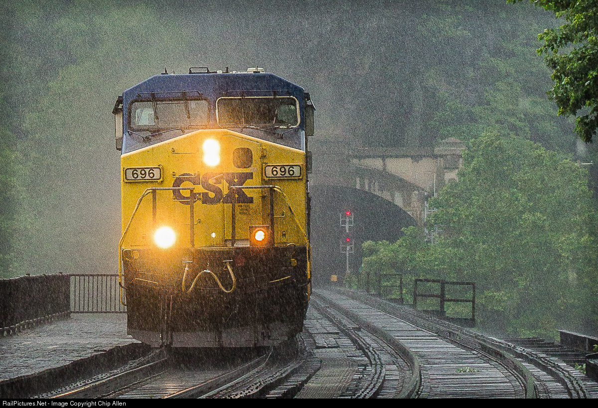 In the midst of a heavy summer downpour, CSX autorack train Q217 hurries across the Potomac River bridge into downtown Harpers Ferry, West Virginia. Minutes later, the rain would stop, but the clouds would continuously clear up and come back, as is expected on any hot summer day.