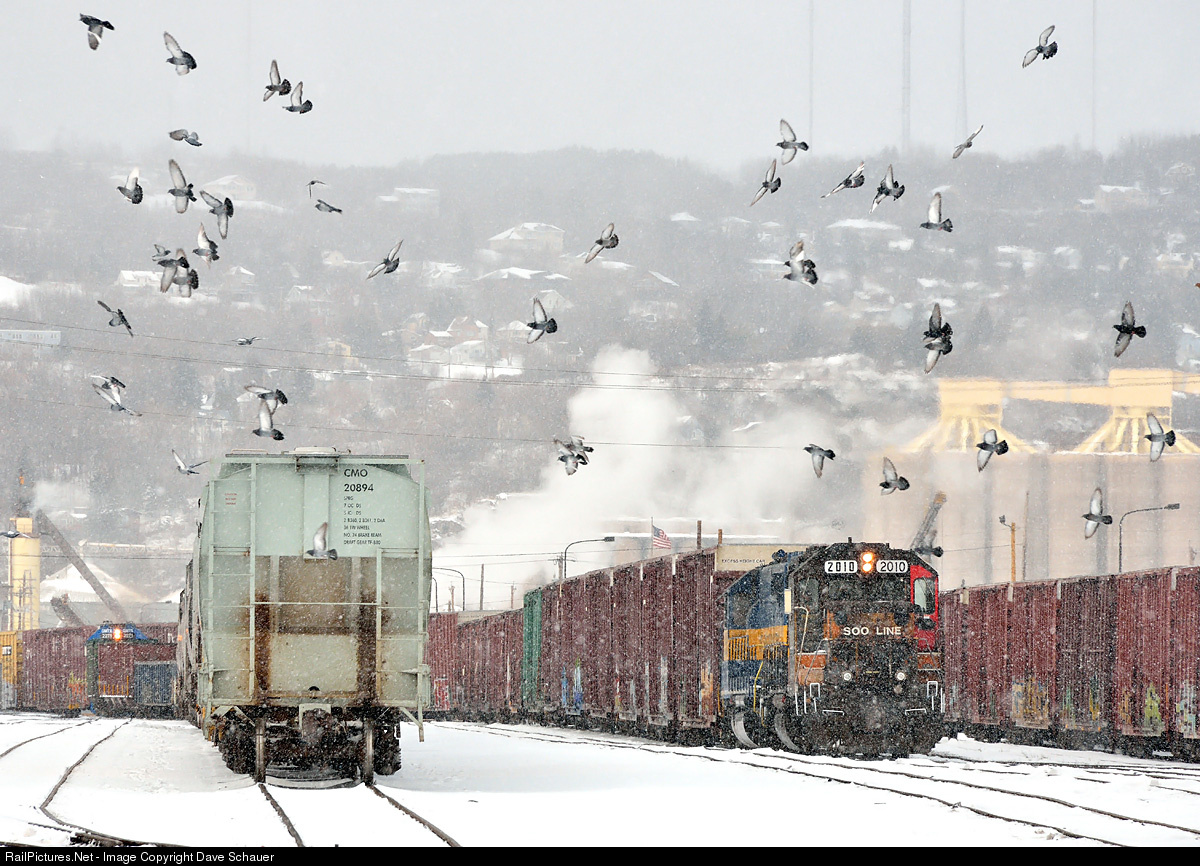 | Almost "Hitchcocked" as a large flock of pigeons take flight upon the arrival of a CP transfer. Spilled grain attracts birds and deer, especially when snow begins to cover the ground. A UP transfer waits to depart on the left. |