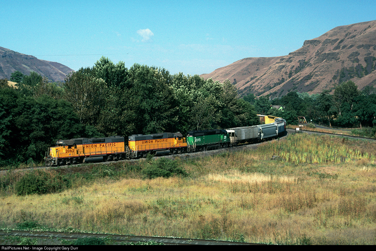 East bound towards Grangeville, Idaho is this days train as it rounds the curve at Spalding, Idaho... This location is actualy a huge Wye, with the small section of track in the fore ground being the East leg of the wye that led to Arrow, Jct on this scenic line in North Central Idaho, just out side of Lewiston, Idaho on the then BN/UP jointly owned Camas Prairie railroad