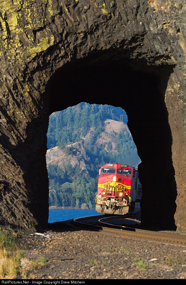 BNSF 4719 leads a grain empty along the Columbia River, just about to enter the Drano Tunnel between Cooks, WA and Hood, WA. |