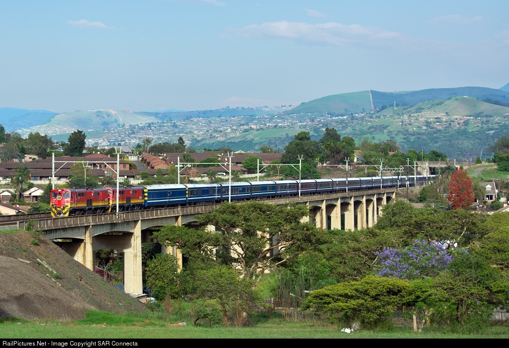 | Sunrise and the Blue Train, headed by 18-773 / 18-788, is seen here crossing the Pentrich Viaduct as it leaves Pietermaritzburg for the final leg of an overnight journey to Durban. The much anticipated promise of a new Class 20E locomotive in special Blue Train livery for this trip did unfortunately not materialise - the special Blue Train locomotives are still in the shops. |