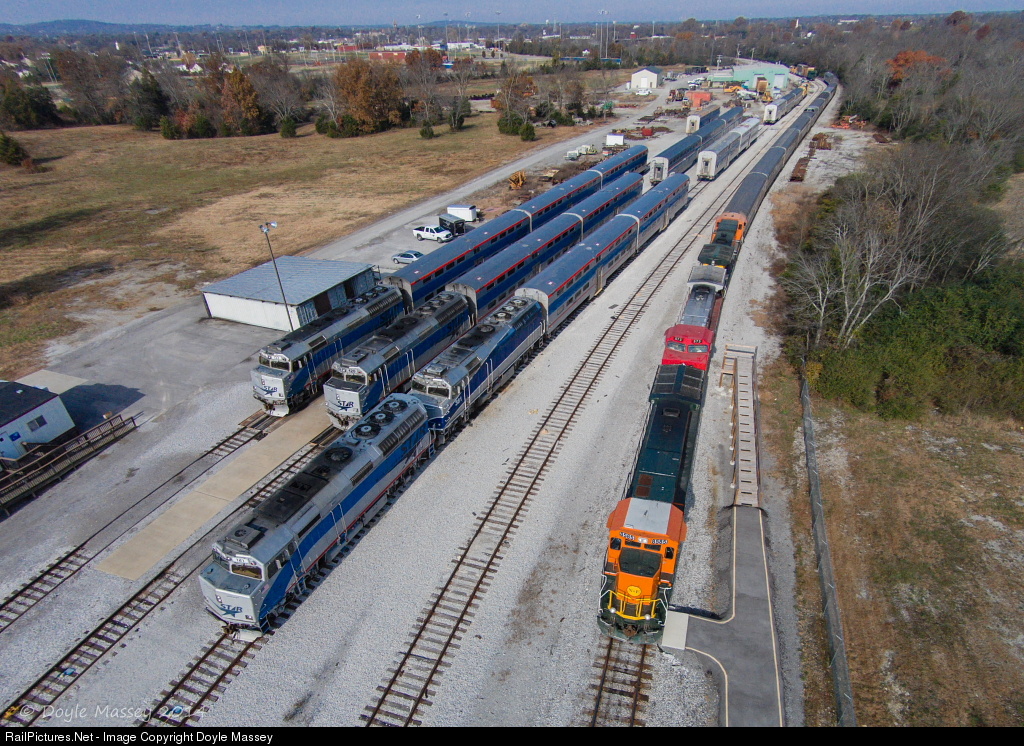 Nashville & Eastern 8585 leads the DelMonaco Winery Fall Excursion east through the Nashville & Eastern shop complex and the Music City Star storage yard. Three N&E locomotives sub for the normal Tennessee Central Railway Museum power.