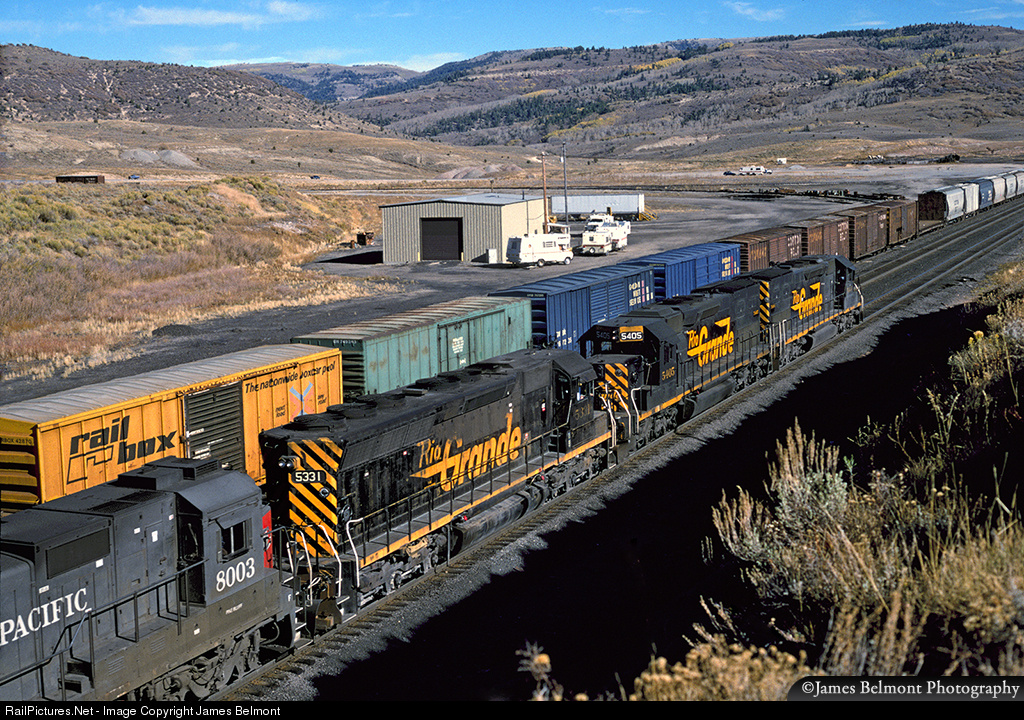 Retired SP conductor Gary Smart recalls with fondness the day he was called to work the RODVF train with engineer Kenny Leighter from Roper Yard to Grand Junction. He arrived at Roper on Oct. 15, 1995 to see his paperwork listing the train’s leader as the SP 5331. He thought “What exactly is the SP 5331? An original SP SD39 or what?” With his paperwork in order and the request for a helper done, he and his engineer were delivered by van to his waiting train . . . much to his surprise and delight, the SP 5331 was actually an original Rio Grande SD45 on the point! DRGW SD45 No. 5331 was trailed by SP B40-8 No 8003 and SP B39-8E No. 8020. The fourth and fifth trailing units were DIC (dead in consist): NS C39-8 No. 8649 and SP AC4400CW No. 178. The RODVF had 73 cars (7 auto racks and 66 cars of piggyback trailers). The two DIC units put the train way over tonnage for the available power and tonnage ratings. When they arrived at Provo, they found out the dispatcher had forgotten to order the helper. Gary reluctantly agreed with his engineer to see how far they could make it without a help. The DRGW 5331 performed flawlessly . . . all 20 cylinders humming along just like it was brand new.