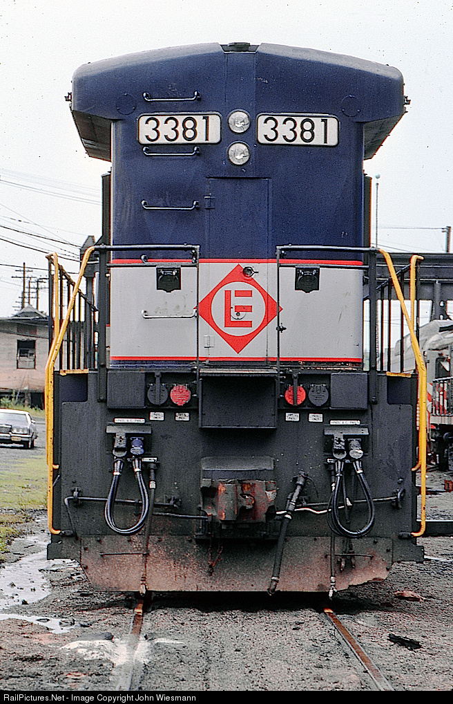Back of the Erie U34CH 3381 at the yards of Elizabethport. The U34CH was built for New Jersey DOT/Erie Lackawanna commuter service. Basically, it was a U36C, but some of the power was used through modifications for train auxiliaries such as heating, air conditioning and lighting.