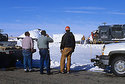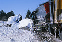 Tough winter day on the Kyle—22 “Whoa,… whoa,… WHOA!,” rings out over the scanner as we pass the Kyle plow extra going through Kanorado, Kansas, on January 2, 2007. I look back to see plow MWK 06 lean over to its left, digging up white snow and then brown earth, with lead SD45T-2 following along. The chase of the plow extra quickly ended, just before reaching the Colorado border, and fortunately, no one was injured. This photo was taken just moments after the derailment; likely cause—ice buildup on a road crossing. Also note mainline rails almost covered by snow in the foreground.