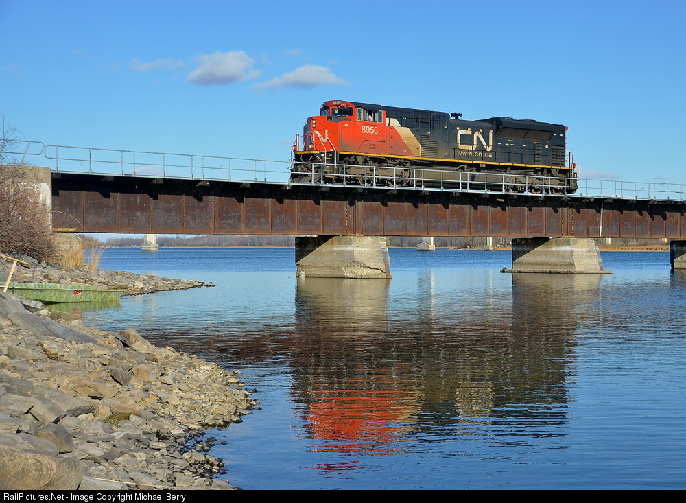CN 323 is composed solely of CN 8956 as it has no cars to bring back from St. Albans, Vermont. It is seen crossing the Richelieu River at Noyan, Quebec, almost back on dry land.