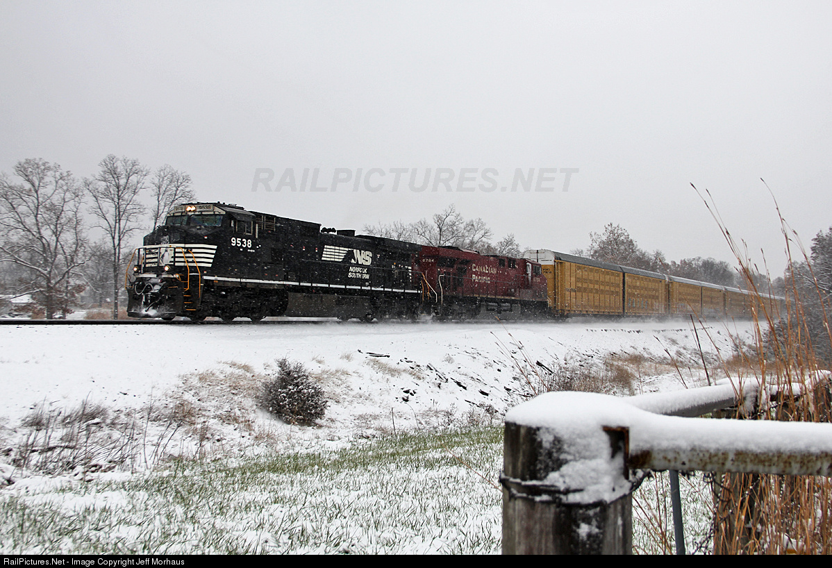 With a rare early snow here in eastern central Missouri, NS 9538 and CP 8764 leads a Knoxville, TN to BNSF's Murry Yard in Kansas City, MO (#112) west near Pendleton, Missouri on Norfolk Southerns St. Louis District.