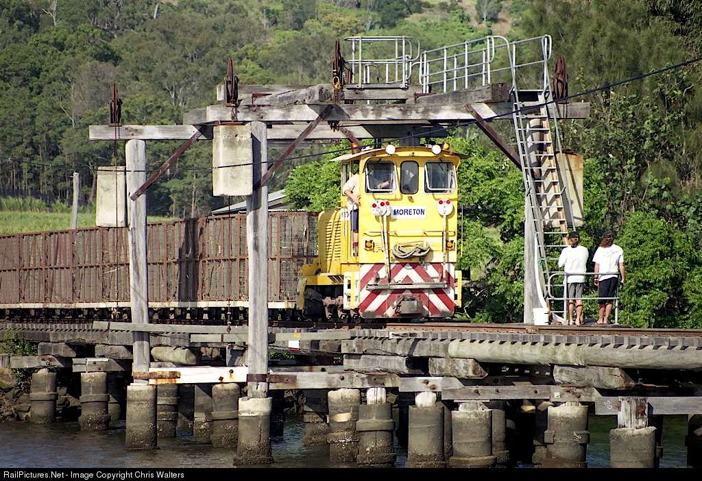 'Moreton' treads carefully over the Maroochy River lift bridge with an empty Moreton Mill cane train bound for the nearby Yandina canefields, Queensland. The mill closed at the end of 2003 and although much of the rail network an infrastructure is now gone, this heritage-listed bridge remains today.