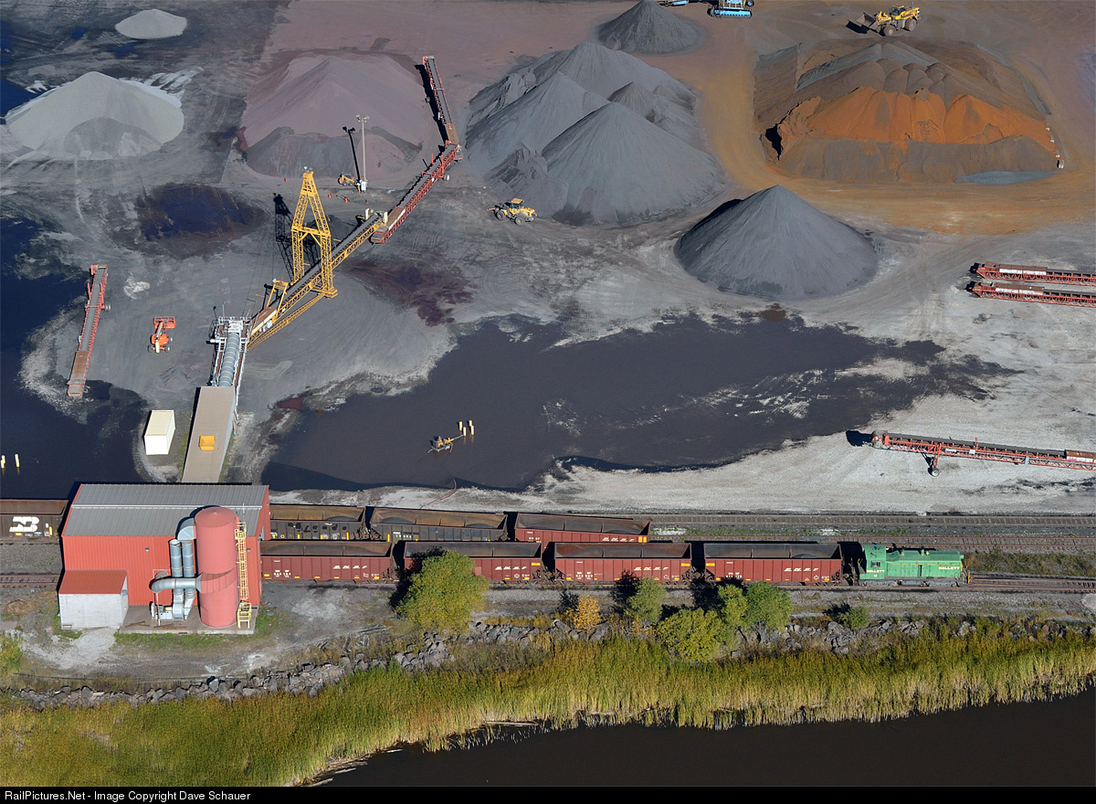 One of Hallett Dock's switchers spots cars of taconite pellet chips/fines at the firm's unloading shed. This ore is from Keewatin Taconite and will be shipped from Hallett Dock by lake vessel to be used as sinter feed. In the upper right is a pile of iron nuggets produced by Mesabi Nugget that will be shipped out by tug/barge.