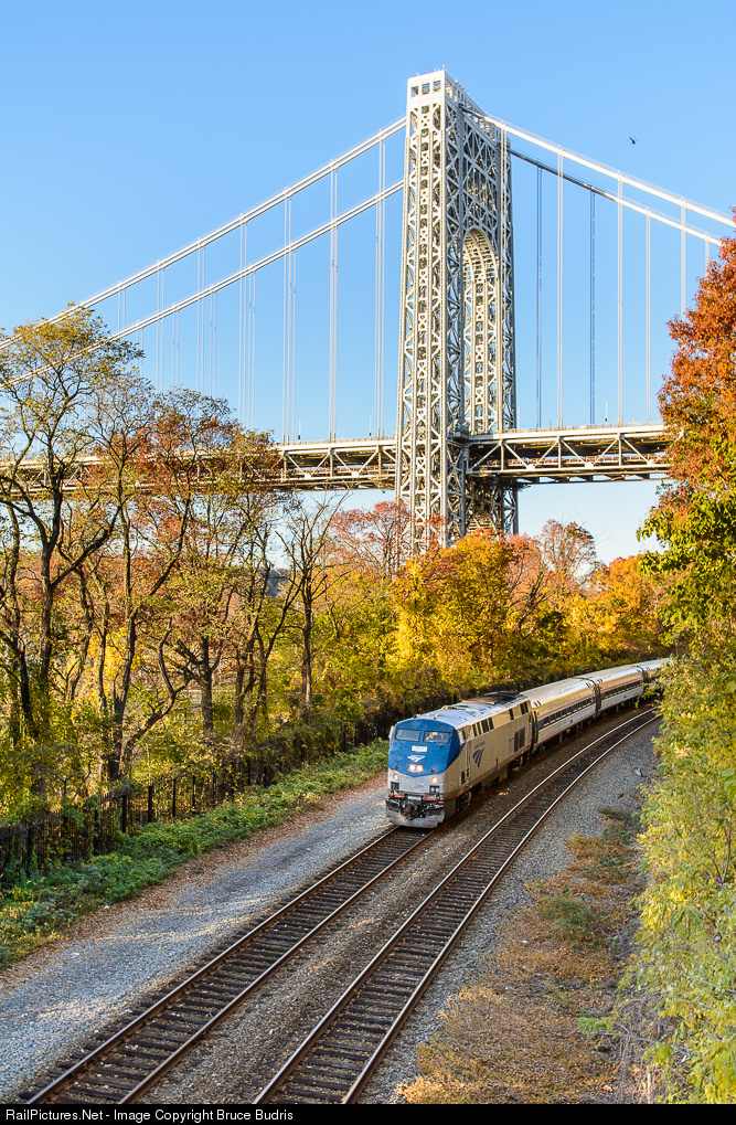 | With its structural engineering wonderfully exposed, the George Washington Bridge forms a backdrop for Amtrak's Empire Service as it makes its way south along the Hudson River in the northern reaches of Manhattan. When the bridge was constructed in 1931, the original intent was to cover the towers with a facade of granite. Fortunately, depression-era cost cutting measures nixed that idea such that we have been left with the beautifully distinctive structure we have today. |