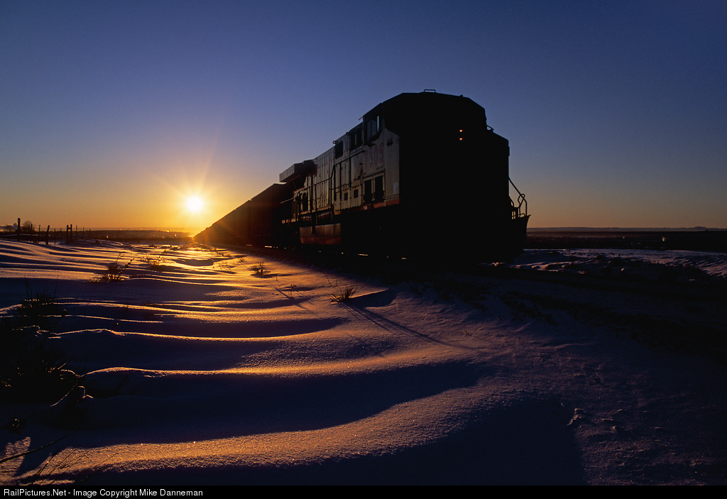 Drifted snow is lit up by a rising sun over the plains as an eastbound Union Pacific coal train descends the 2% grade toward Denver with lone DPU GE AC4400CW No. 7305 on the rear west of Leyden, Colorado, on January 22, 2007.