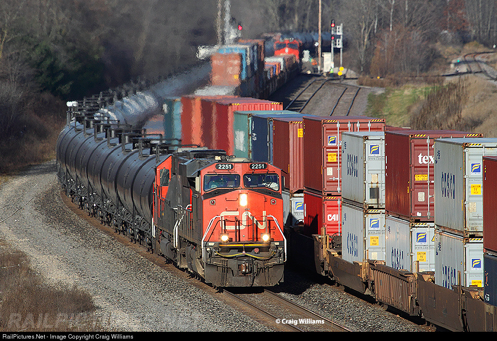 An extra manifest train from Symington, AB, to Memphis, TN, works pass a Q191 in the siding at Ackerville. This heavy manifest train is running 2x2 DP-ed as it makes the long trip from Canada to the Gulf. Train is mainly madeup of Canadian oil bound for Gulf destinations along CN and KCS.