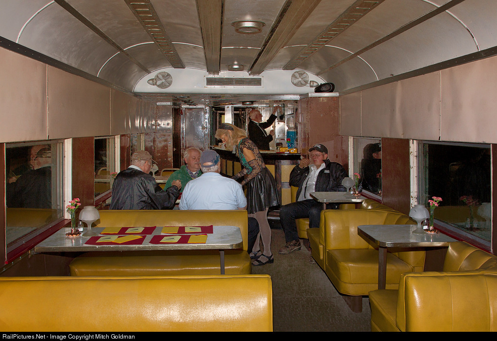 Inside the "tavern-lounge" of the Red Arrow "Liberty Liner". This car provided coffee and pastry in the morning, and beverages and snacks in the evening. They even carried a liquor license. We were served appetizers and pie tonight during our excursion on Saturday night. For a view of the train itself, click here.