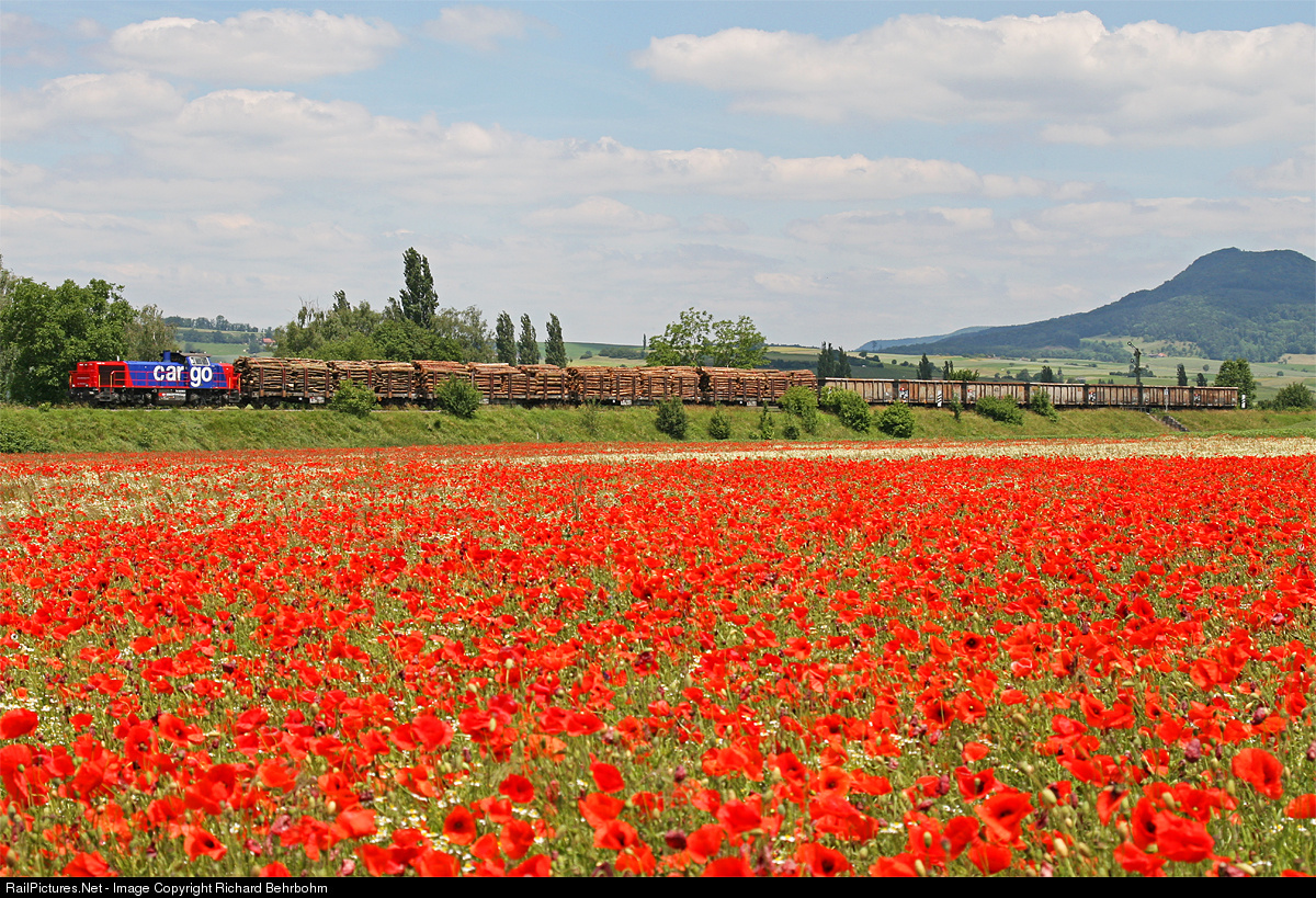 Along a poppy field Am 843 093 is pulling a freight train Schaffhausen - Lauchringen.