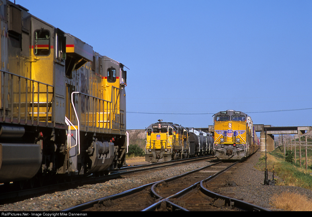 UP action at Sidney Two Union Pacific stack trains meet at Sidney, Nebraska, as the local with two SD40-2s, waits to get out on the busy UP main on the morning of July 11, 2008. I almost got four trains in this photo; moments after this photo, a southbound BNSF coal train crossed over the scene on the bridge in the background. See RailPictures.Net photo ID 399918: CLICK HERE