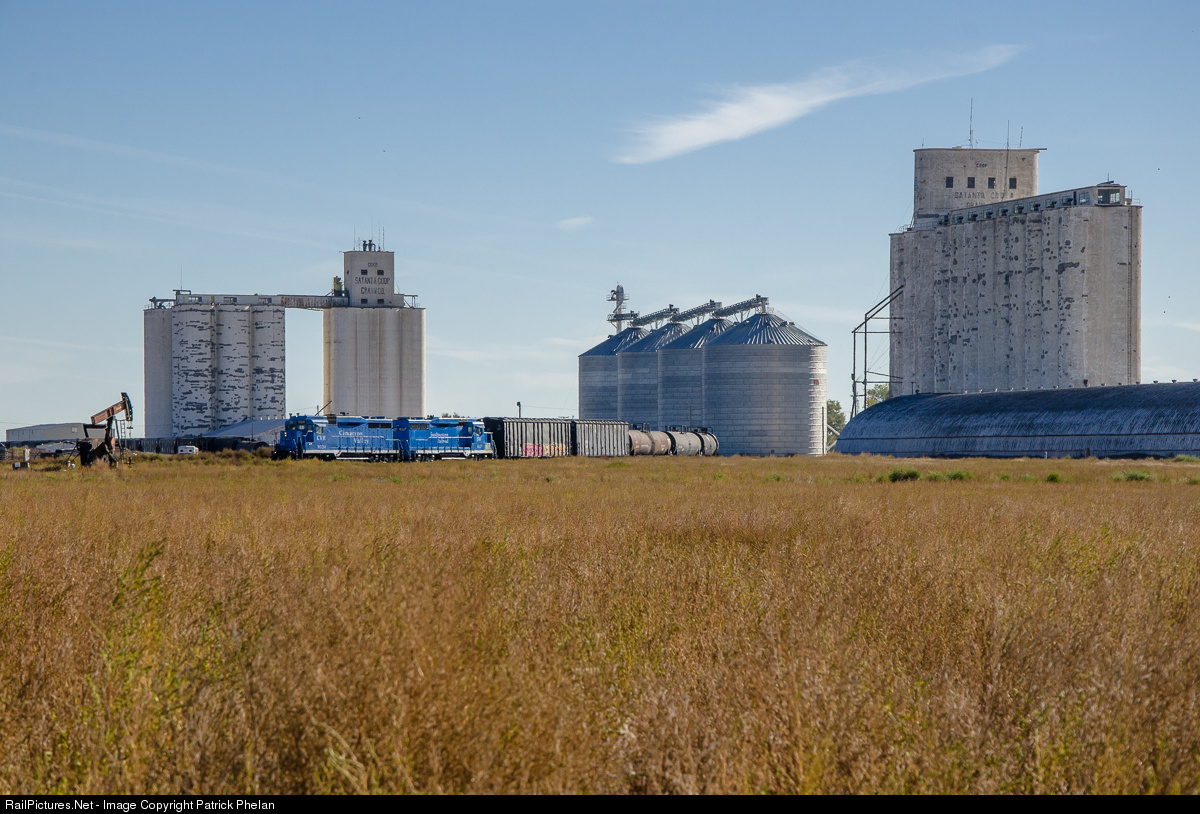 Cimarron Valley's job to work the carbon black plant near Ulysses departs Satanta behind a pair of GP30s as the prairie skyscrapers loom in the background.
