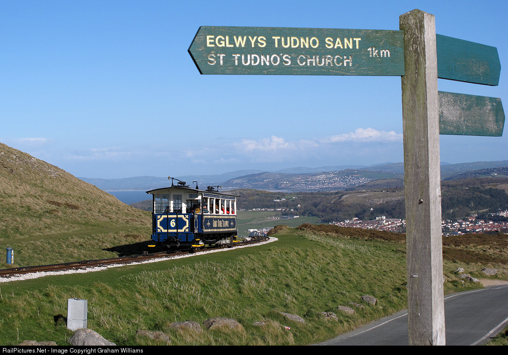 A Llandudno Great Orme Tramway tram departs the summit with the last service of the day on the upper section on a sunny April Saturday. This line is a cable-hauled 3 ft 6 in (1,067 mm) gauge tramway in Llandudno in North Wales. This is Britain's only remaining cable operated street tramway. It takes passengers from Llandudno Victoria Station to just below the summit of the Great Orme headland. This tramway is not a cable car but is a street running funicular, where the trams are permanently fixed to the cable, and are stopped and started by stopping and starting the cable. As one tram ascends, the other descends, passing each other at the mid-point. The tramway was opened in 1902 It has two sections which operate independently, with two trams on each section. The system has gradients as steep as 1 in 3.8. The tramcars, have all been in service since opening in 1902.